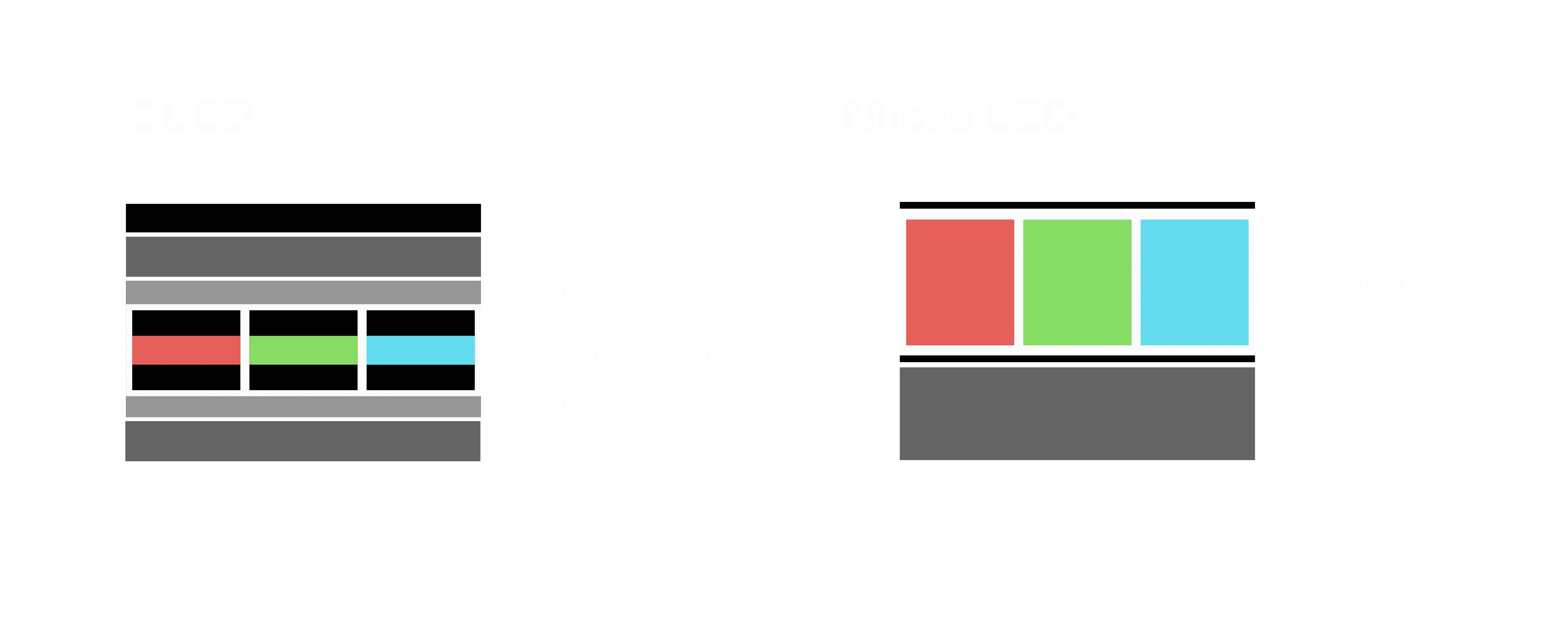 以 LED 做为显示画素,,,,可让 LED 的发光效率发挥到极致,,从而让显示器具备优异的亮度表现,,不论是在户外或室内,,,,均具备出众的显示效果。。。同时,,与使用有机材料的 OLED 相比,,,LED 具备更稳定、、、、寿命更长的特性,,,,不仅不会有画面烙印问题,,,而且更不容易出现故障、、坏点。。。