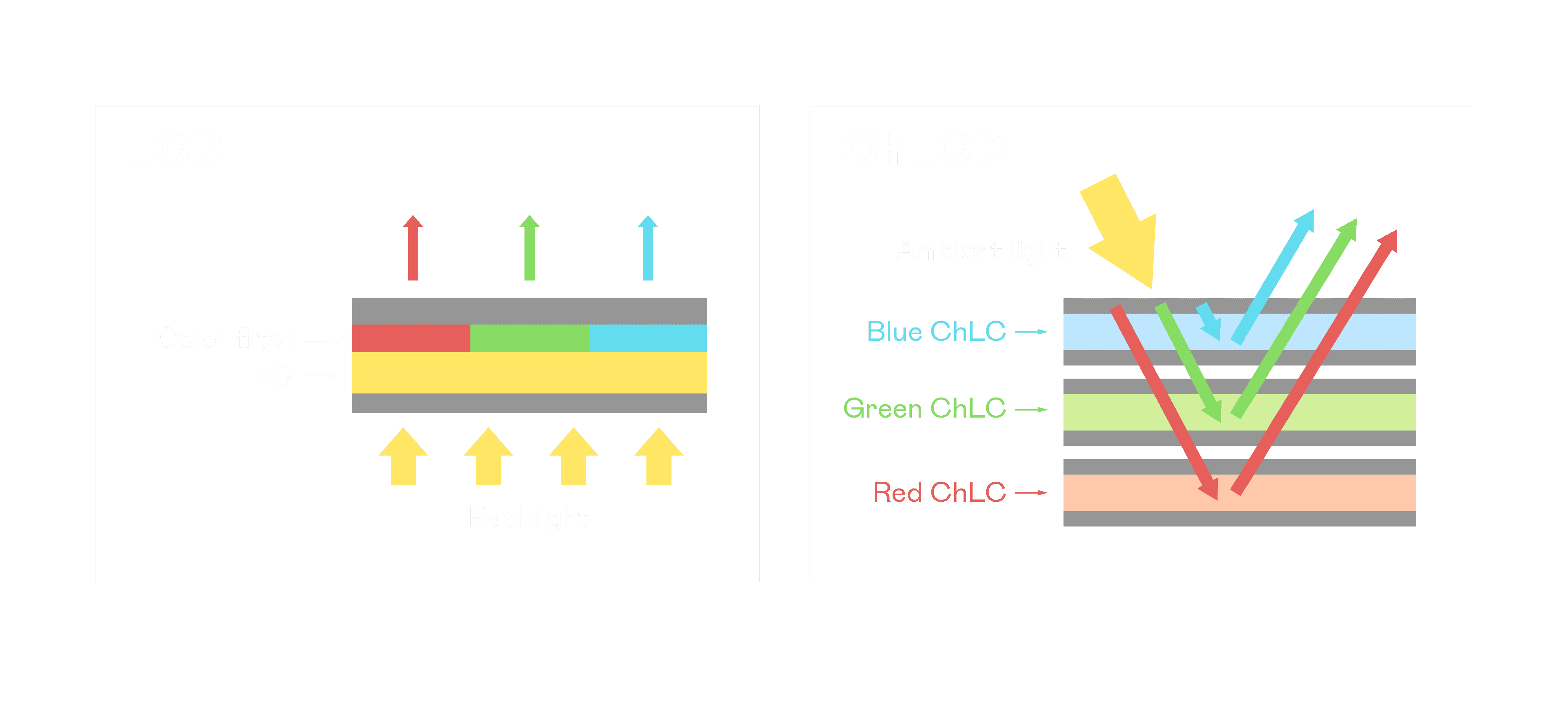 ChLCD 胆固醇液晶就如同纸张一样,,,,透过反射环境光来显示影像,,,因此长时间观看不易造成人眼视觉疲劳,,可达到护眼效果。。。当处于户外阳光下使用,,LCD 影像容易失真而不易观看,,但胆固醇液晶仍可维持较佳的影像品质。。。。